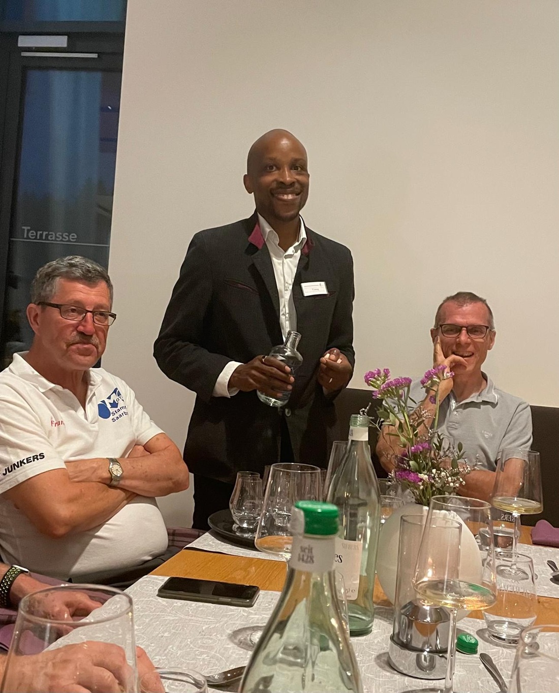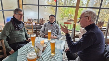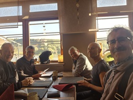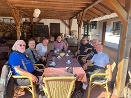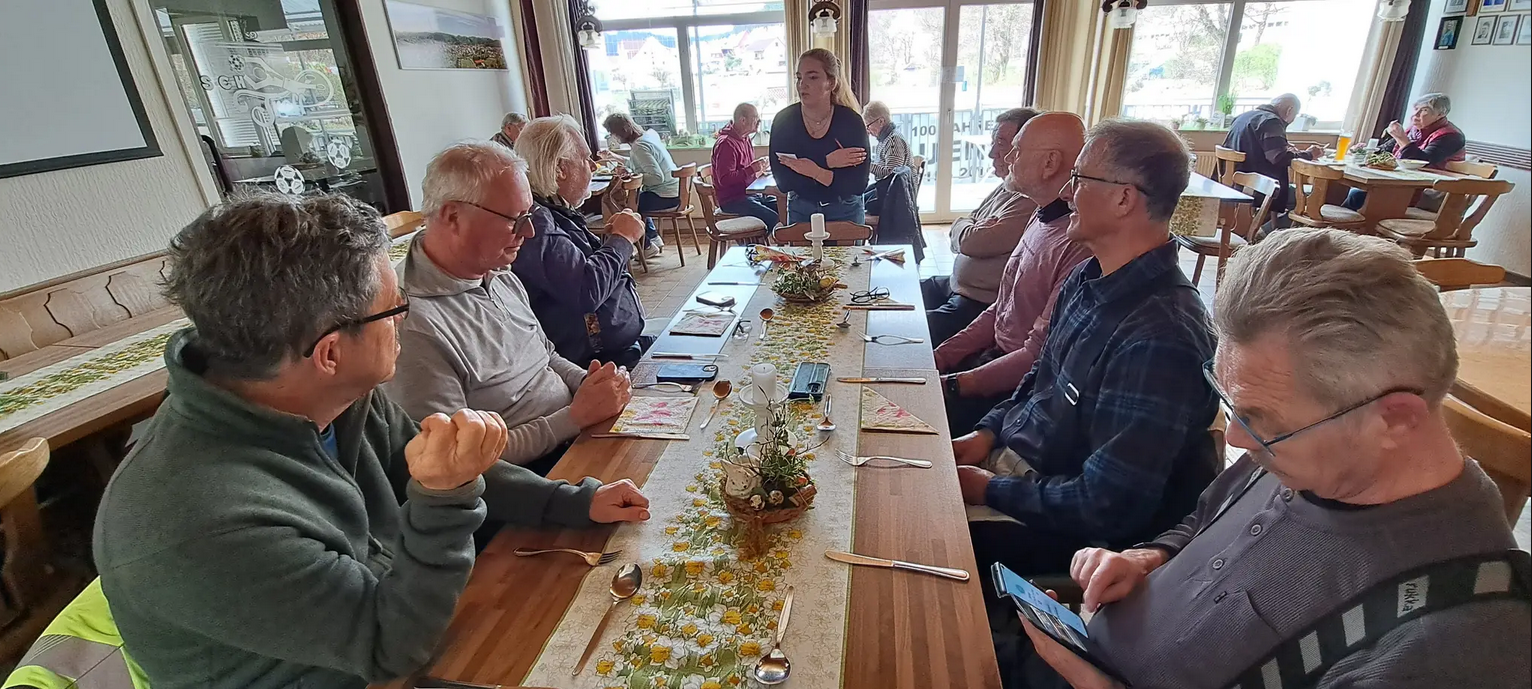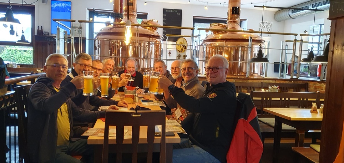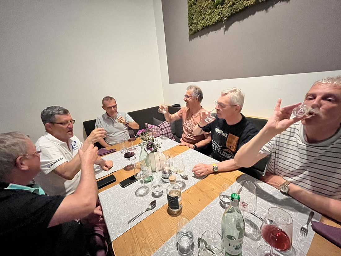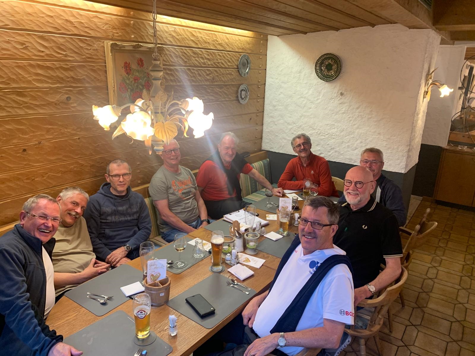 Gelöste Stimmung beim Mittagessen im Restaurant des „Zylinderhauses“, als es dann endlich serviert wurde. Lecker! Trotz fortgeschrittener Zeit beim Aufbruch retour vermeidet Michael den schnellen Einstieg zur Autobahn. Erst ab Tholey-Hasborn erfolgt der individuelle Endspurt über die A1, nachdem es von Jürgen B. bei einer Abschlusspause noch mal Wegzehrung in Form von Croissants und Laugenecken gibt.