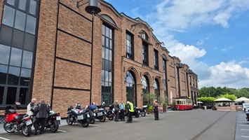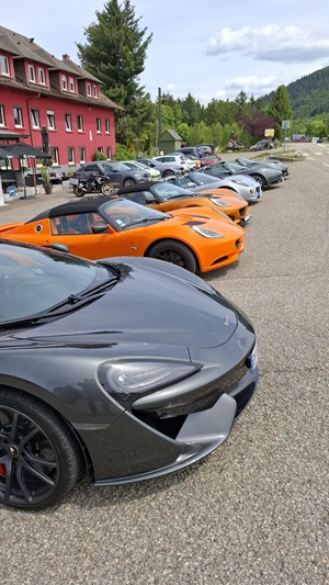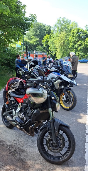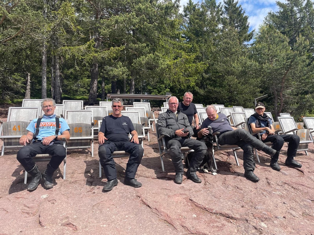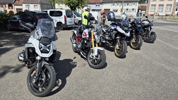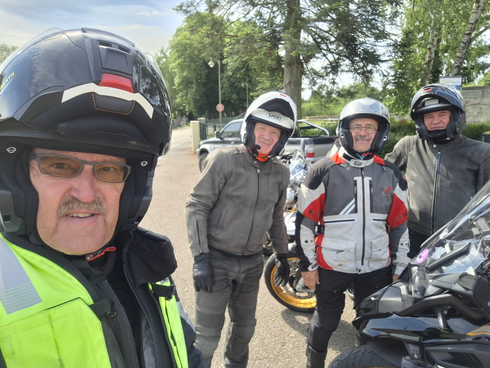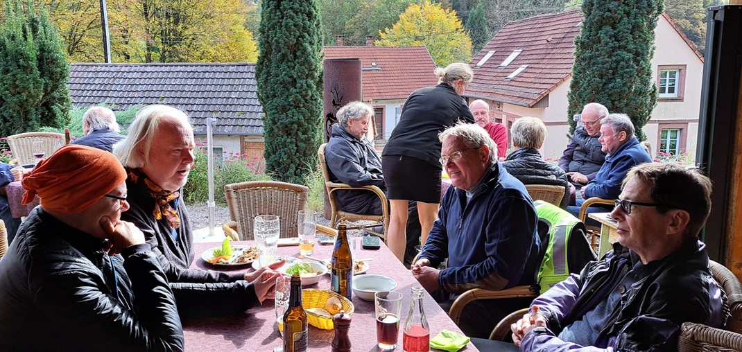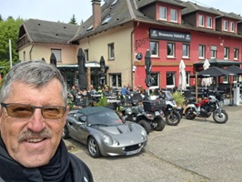 Boulevard Güdingen - Abfahrt erst um 9.30 Uhr – es sollte morgens noch frisch sein! Frank, Rolf, Jürgen B. und Tourguide Dirk machen sich auf den Weg. In Berthelming komme ich vom Stockweiher aus dazu. Keine Ahnung, welche Strecke die vier schon hinter sich haben, auf jeden Fall ist Kaffeepause angesagt und der Kaffee aus Franks mobiler Kaffeeküch ist noch heiß. Ziel für die Mittagspause ist der Donon ( https://www.hostellerievelledadonon.com/restaurant-thoms-hotel-piscine-spa-grandfontaine-alsace ) den wir zwar auf großzügigem Umweg über kleine Straßen anfahren, trotzdem viel zu früh ankommen: Die Kneipe hat noch geschlossen. Also startet Dirk durch auf eine südliche Warteschleife über routes forestières: Col de Prayé und Col de Hantz. „Wandertour!“ so Frank. Der Col de Prayé ist zwar mittlerweile asphaltiert, weist aber bereits tückische Wunden auf: Tiefe Schlaglöcher, in denen mit Kiesabbau begonnen werden könnte! Nix für Tagträumer und Landschaftsgucker! Über Schirmeck geht`s zurück zum Donon und zum Mittagessen. Wurde auch Zeit! In angemessener Gesellschaft parken wir die Motos: Ein französischer Club bevölkert mit Lotus Cars den Parkstreifen - überwiegend Lotus Elise. Die sind bestimmt nicht über den Col de Prayé gefahren 😉 Verlief die Tour bis dahin bei teilweise wirklich frischer Temperatur von 12°, sitzen wir jetzt behaglich bei Sonnenschein zum Essen sur terrasse. Danach cruisen wir vom Donon abwärts entlang der Sarre Blanche. Aus Zeitgründen verzichten wir auf das 2CV-Museum in Troisfontaines: https://2cv-museum.com/