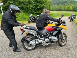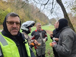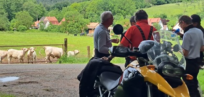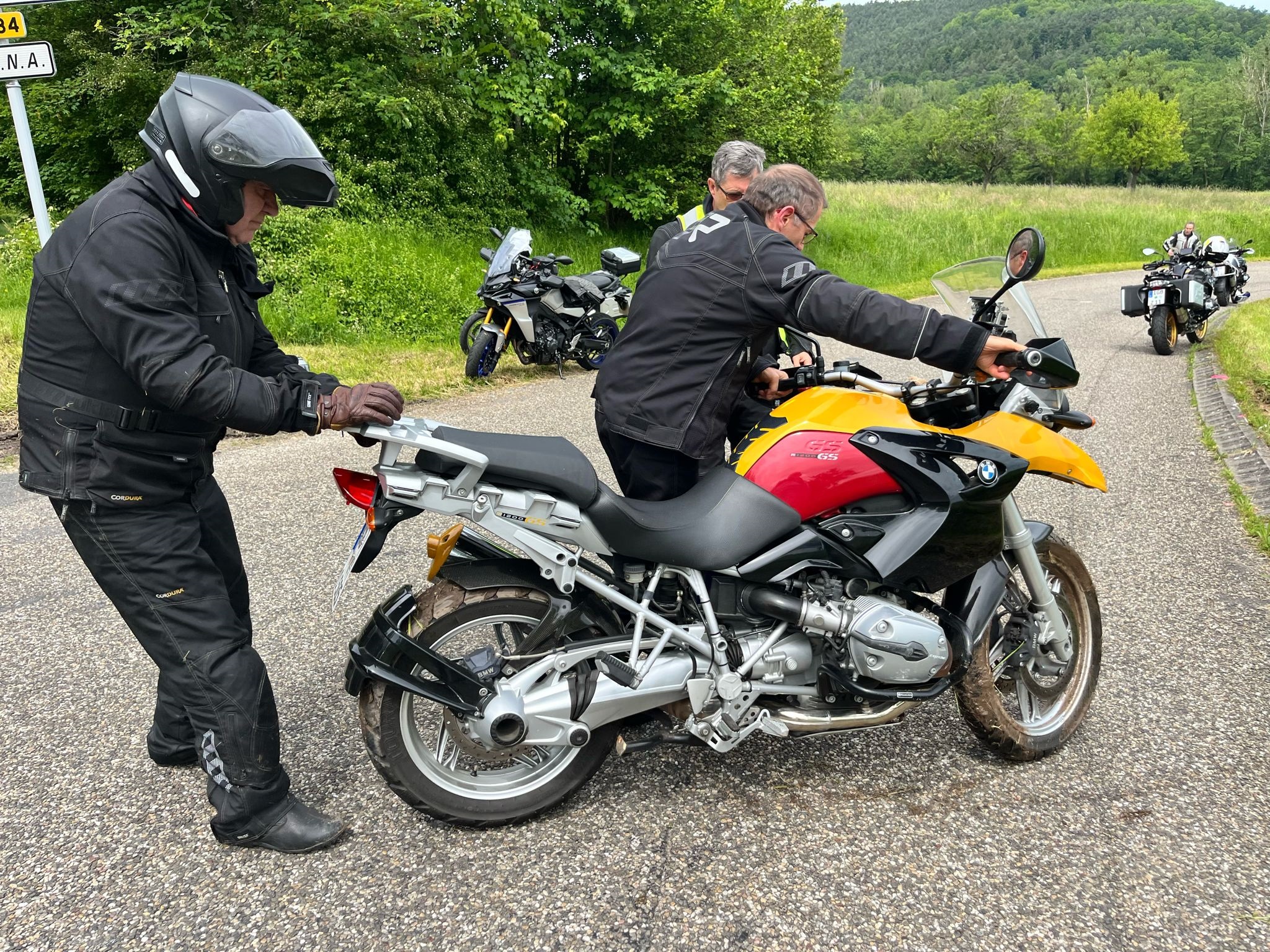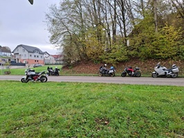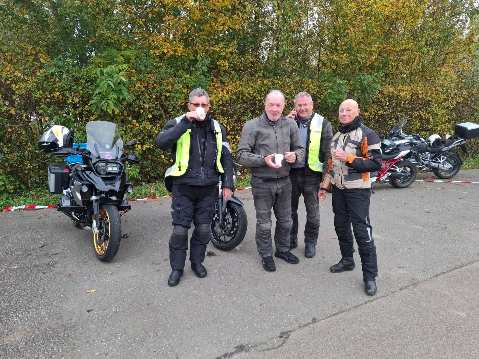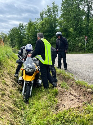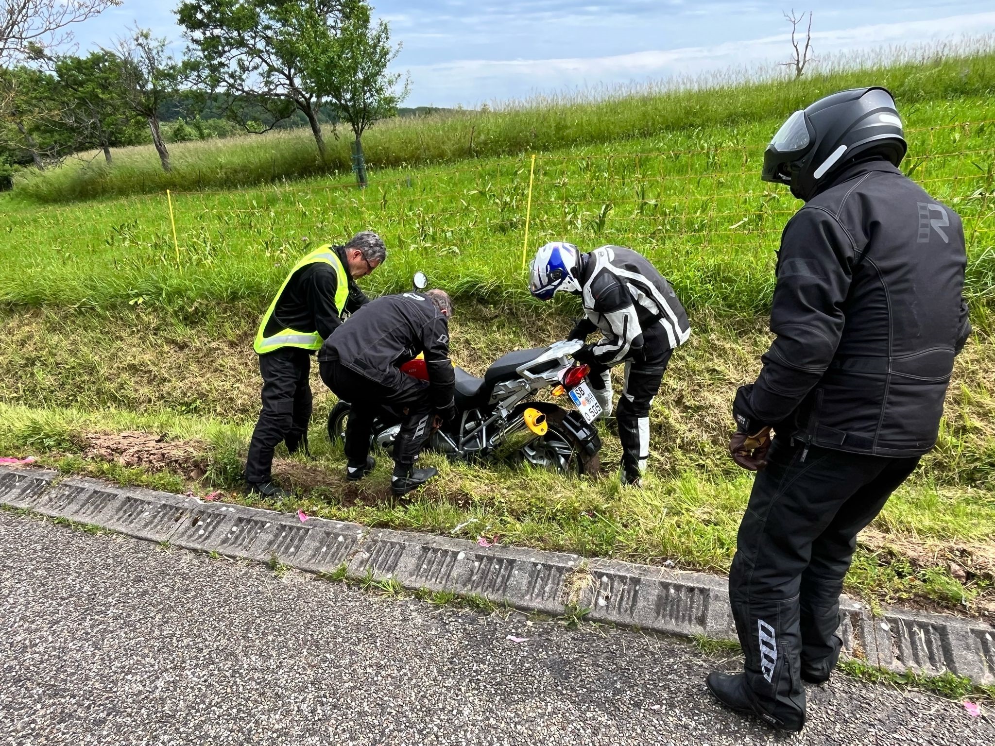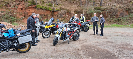 Gut versorgt starten wir auf recht freien Straßen – es ist Sonntag! Besser gesagt: Verkehrsarmen Straßen, denn schon bald stehen & drehen wir an der ersten „Route barrée“. Genau das wird den TourGuide Torsten noch öfter anhalten lassen, um passende Alternativrouten zu suchen. Geduldig fahren & wenden hinter ihm: Anne, Jürgen F., Frank, Michael und Thomas. Eine recht frühe, dafür umso längere Kaffeepause gibt es in Oermingen. Alles läuft bestens, denn es ist Mittagszeit und die meisten sitzen bei ihrer Plat du jour. Der Himmel zeigt freundlich-helles Grau, lässt vereinzelt Sonne durch. Feuerhake, das Schlitzohr, hat sich was Besonderes ausgedacht und prüft an einem Abzweig die Geländetauglichkeit seiner BMW und damit die Tiefe des Straßengrabens, der sich zusätzlich als ordentlich matschig zeigt. Mit Hupton bleibt sein Moto aufrecht im Schlamm stehen: Rien ne va plus! Mensch und Maschine unversehrt. Mit Hilfe von Gurten und mit „Bärenkräften“ wird die BMW aus dem Schlammgraben befreit und Feuerhake von Torsten zu Rolf.zwo ernannt 😊Nach dieser Rettungsaktion passt der Zielort Baerenthal umso mehr, vorher gibts Baguette/Käse/Wurst zur verdienten Stärkung. Da das Hellgrau des Himmels stellenweise leicht ins Dunkelgrau wechselt, wird bei Bitche die schnelle Heimfahrt über RN beschlossen. Michael lag mit seiner Prognose goldrichtig: „Regen gibt es nur unter einer Wolke“ So ein kleines Regenwölkchen besprenkelt uns kurz vor Saargemünd unerheblich – alle kommen so gut wie trocken nach Hause. Knapp 200km – trotz oder wegen der routes barrées? Danke Torsten für deine Geduld und die prima Strecke.