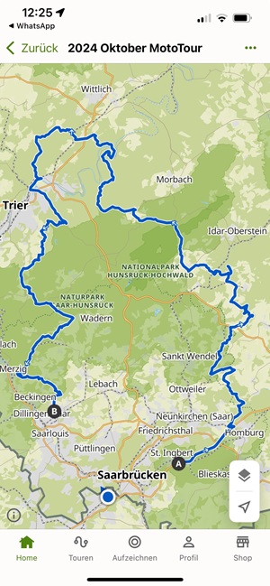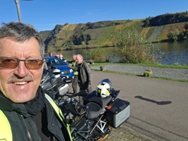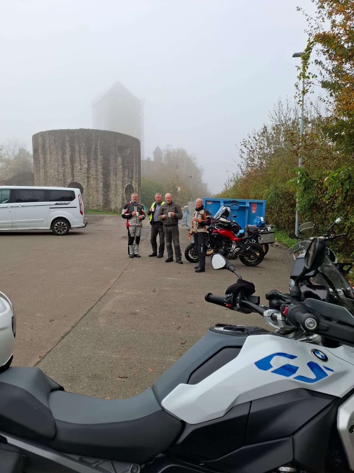 Aus dem Morgendunst zur Tour im Oktober geführt von Frank tauchten auf: Helmut, Dirk, Jürgen B. und Anne. Zügig ging es durch mehr und weniger Nebel, ab und zu war lediglich die gelbe Weste des Vorfahrenden zu erkennen. Die Suche nach Sonne ging nach der Kaffeepause an der Burg Lichtenberg https://de.wikipedia.org/wiki/Burg_Lichtenberg_(Pfalz) bei Thallichtenberg weiter. Und wirklich stieg die Temperatur rasant von 11° auf 18°, als der Dunst sich endlich nach ca. 2 Stunden Fahrt verzog! Sonne satt bei der Mittagspause an der Mosel https://www.moselblick-piesport.de/ Das mit dem satt wurde fraglich, als Helmut die „überschaubare“ Portion seiner Linsensuppe betrachtete….Sollte das Vor- oder Hauptspeise sein? Das Essen war gut, für manchen aber an der Grenze zu homöopathischer Dosierung 😉