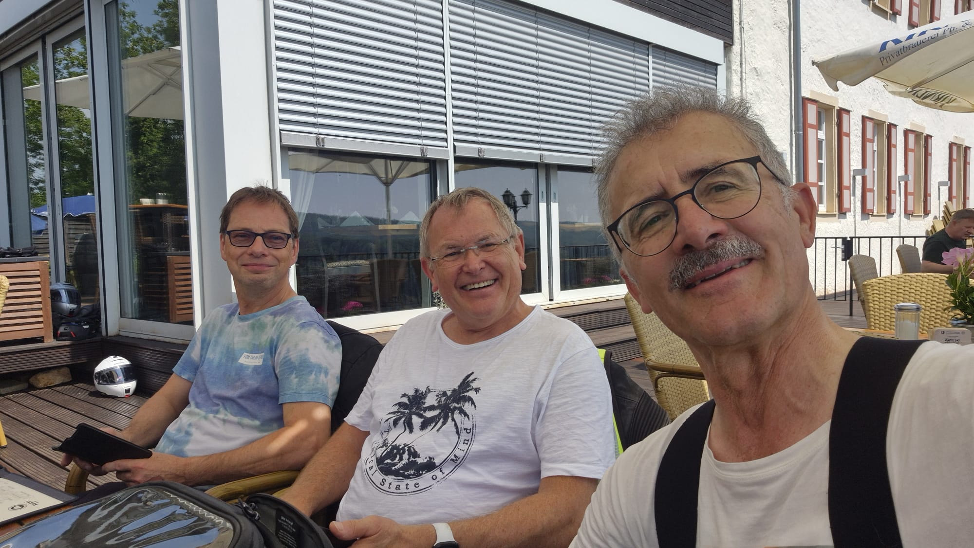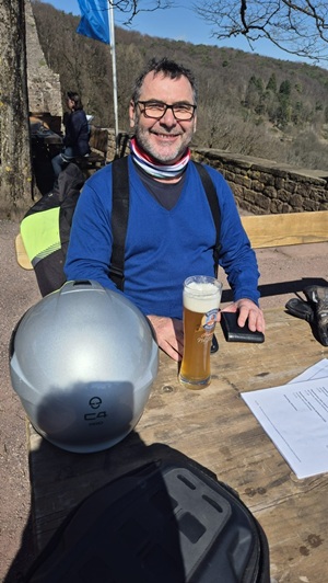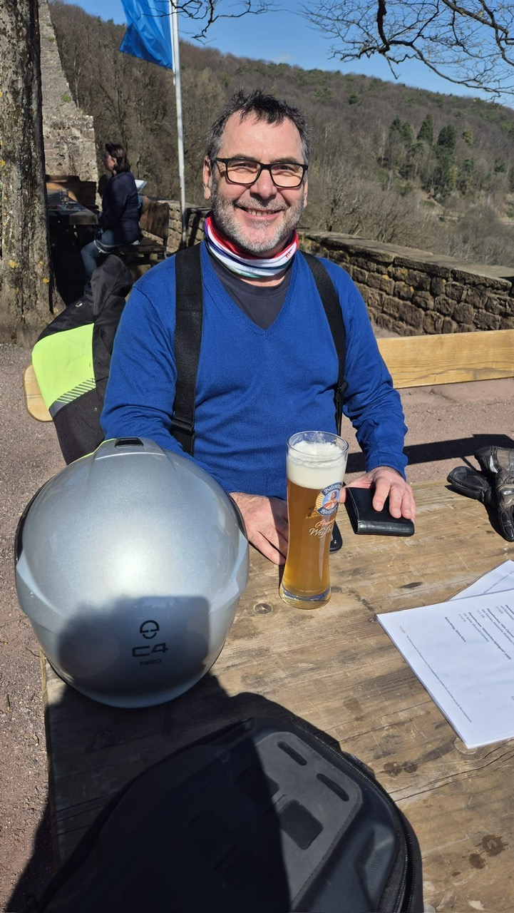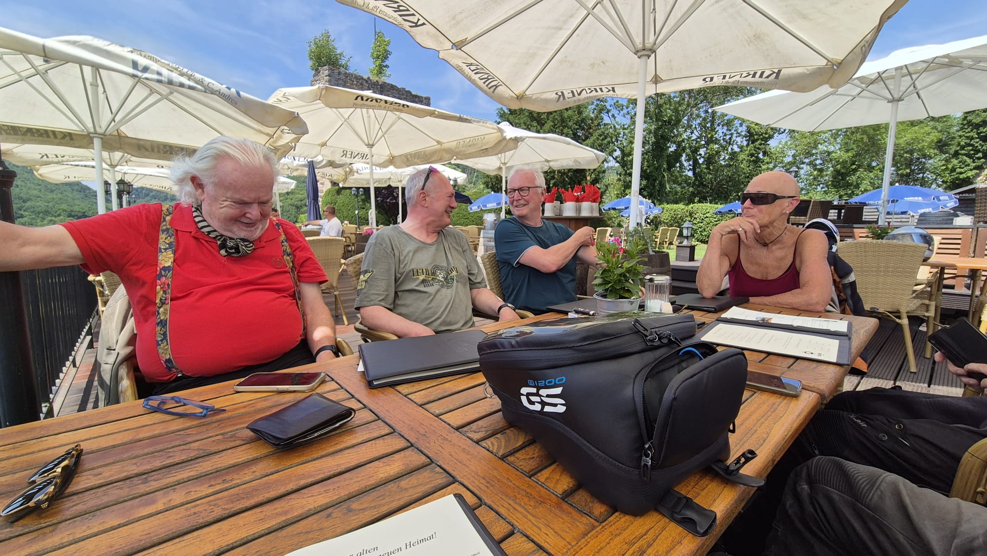 Im Jahr 2021 übte er zum ersten Mal: „Jürgen B. und die Jungfernfahrt“ (siehe Archiv 2021) Michael vergab ihm nach weiteren Touren den Titel „Neuer Stern am Himmel der Tourguides“ Bei der Tour am 14.Juni 2025 zeigte sich Jürgen B. als versierter Tourplaner, der sich selbst durch sein Navi nicht irritieren ließ. Wenden sollte jedoch ab und zu geübt werden – nicht wahr, Anne - also taten wir das dann mal öfter… Start der Tour war um 24° in St.Ingbert: Anne, Rolf, Martin, Helmut, Michael und Marwin reihten sich hinter Jürgen B. ein, der zügig Ortschaften querte und erste Kurven zum „Warmfahren“ im Programm hatte. Pause mit Kaffee & Croissants (Villemols merci, Jürgen) am Bostalsee, der doch sehr den Drang nach einem Sprung ins kühle Nass weckte! Mit dem Gedanken an kühles Bier (alkoholfrei!) schrubbten wir die nächste Hälfte bis Kirn, wo wir um 32° weit oberhalb des Ortes im Restaurant auf der Kyrburg https://www.kyrburg.de/ einkehrten. Heftige Windböen machten den Sonnenschirmen auf der Terrasse zu schaffen – auf uns wirkte es eher als sanfte Brise ohne nennenswerten Abkühleffekt. Die große Hitze führte zur Überlegung, den Rückweg nicht allzusehr auszudehnen, denn zuhause wartete ein kühles echtes Bier 😊 und vielleicht sogar ein Pool! Jede Tour hat was ganz Eigenes, und das präsentierte Jürgen im Endspurt des Tages. Sei ehrlich, Jürgen, das war die Streckenführung deiner letzten Radtour 😉 mit idyllisch kleinen Wegen durch Feld und Wald. Formidable! Und das kalte Bier zuhause erst recht!!!