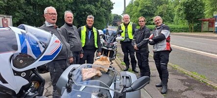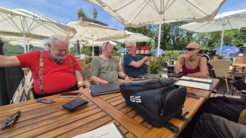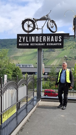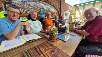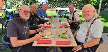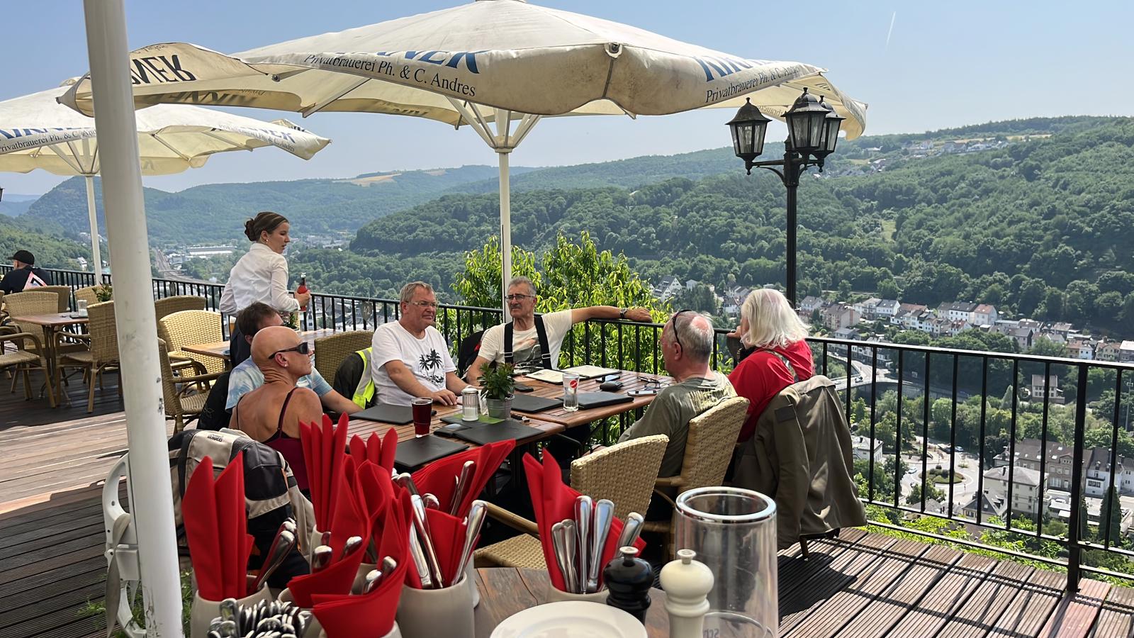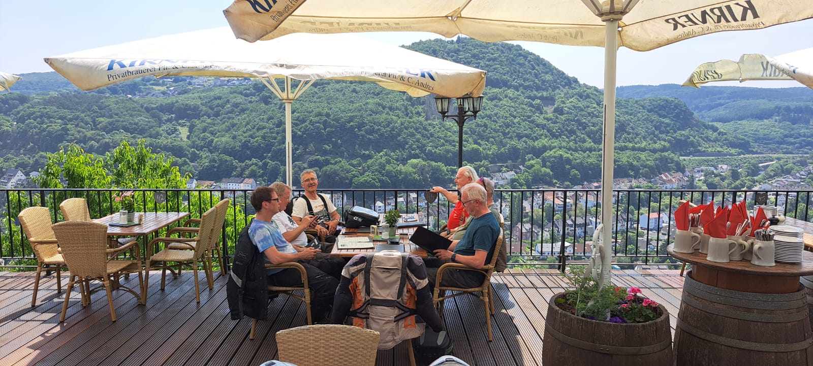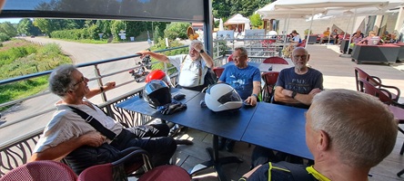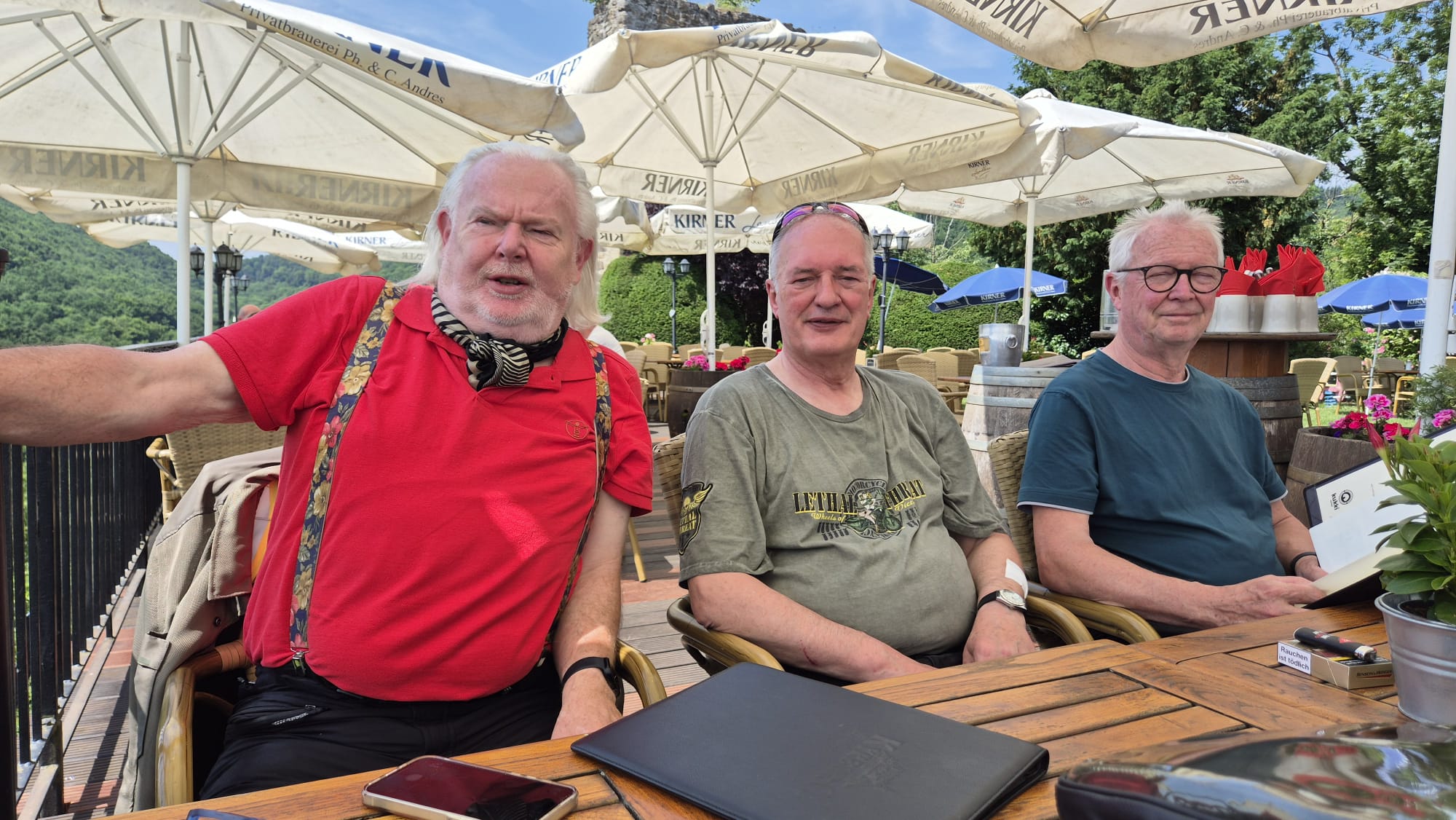 Im Jahr 2021 übte er zum ersten Mal: „Jürgen B. und die Jungfernfahrt“ (siehe Archiv 2021) Michael vergab ihm nach weiteren Touren den Titel „Neuer Stern am Himmel der Tourguides“ Bei der Tour am 14.Juni 2025 zeigte sich Jürgen B. als versierter Tourplaner, der sich selbst durch sein Navi nicht irritieren ließ. Wenden sollte jedoch ab und zu geübt werden – nicht wahr, Anne - also taten wir das dann mal öfter… Start der Tour war um 24° in St.Ingbert: Anne, Rolf, Martin, Helmut, Michael und Marwin reihten sich hinter Jürgen B. ein, der zügig Ortschaften querte und erste Kurven zum „Warmfahren“ im Programm hatte. Pause mit Kaffee & Croissants (Villemols merci, Jürgen) am Bostalsee, der doch sehr den Drang nach einem Sprung ins kühle Nass weckte! Mit dem Gedanken an kühles Bier (alkoholfrei!) schrubbten wir die nächste Hälfte bis Kirn, wo wir um 32° weit oberhalb des Ortes im Restaurant auf der Kyrburg https://www.kyrburg.de/ einkehrten. Heftige Windböen machten den Sonnenschirmen auf der Terrasse zu schaffen – auf uns wirkte es eher als sanfte Brise ohne nennenswerten Abkühleffekt. Die große Hitze führte zur Überlegung, den Rückweg nicht allzusehr auszudehnen, denn zuhause wartete ein kühles echtes Bier 😊 und vielleicht sogar ein Pool! Jede Tour hat was ganz Eigenes, und das präsentierte Jürgen im Endspurt des Tages. Sei ehrlich, Jürgen, das war die Streckenführung deiner letzten Radtour 😉 mit idyllisch kleinen Wegen durch Feld und Wald. Formidable! Und das kalte Bier zuhause erst recht!!!
