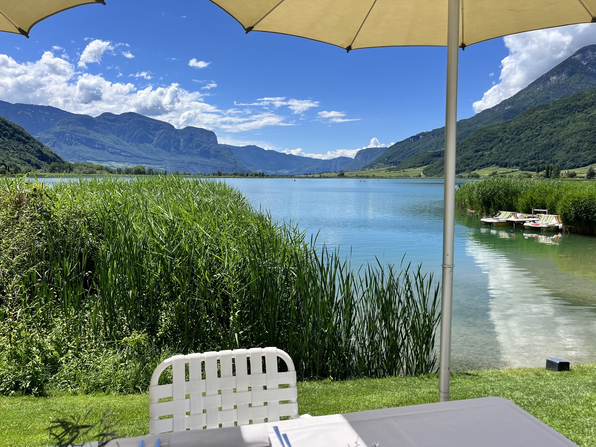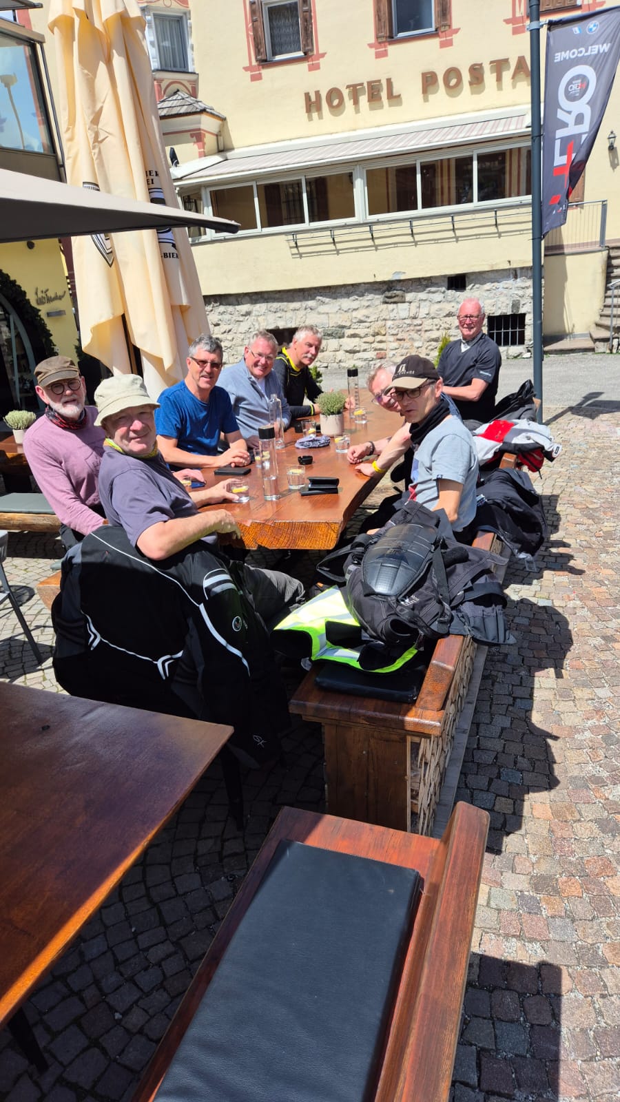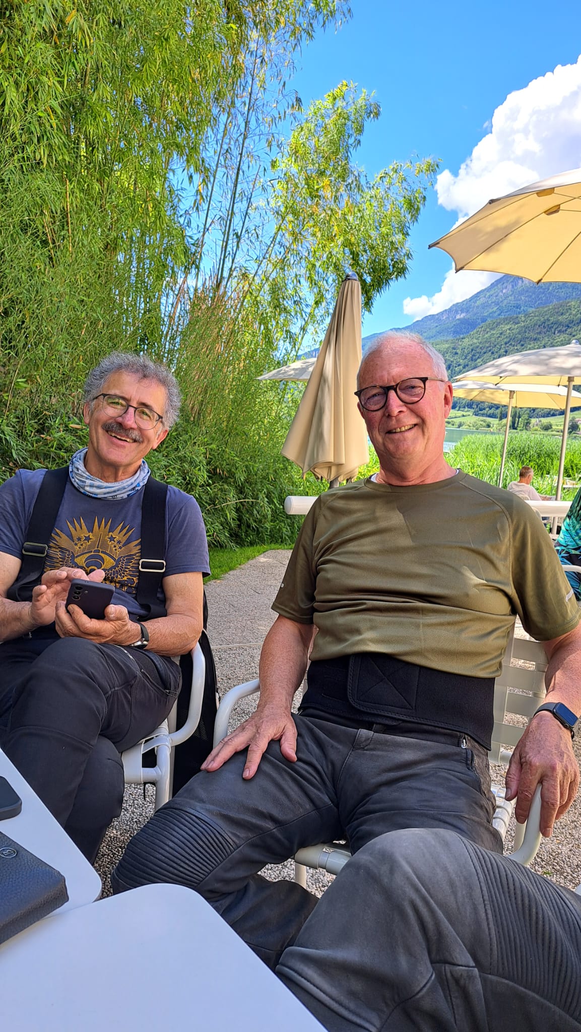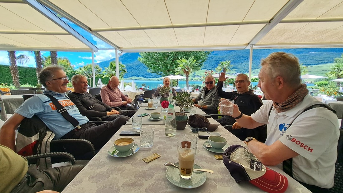 12 Grad bei Abfahrt. Dirk führt Richtung Süden Gampenpass, Mendelpass. Stefan hadert mit der italienischen Zapfsäule und nimmt eine Benzindusche. Kalterer See. Kaffeepause bei schönstem Sonnenschein direkt am See. Danach Lavaca Pass und bei 30 Grad durch Bozen wieder nach Hause. Willkommene 3/4 Pension mit leckeren Kleinigkeiten herzhaft oder süß. Das Gewitter und ordentlicher Regen ficht uns nicht mehr an! Wir sind in der Sauna und dann beim Galadinner