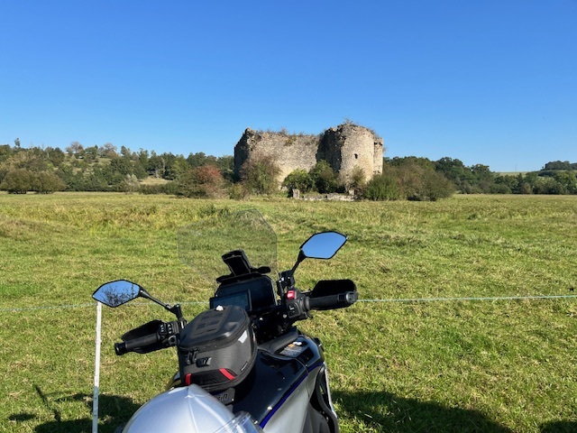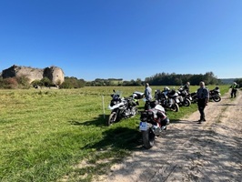 Aber noch sind wir bei Wengelsbach.4 – und Helmuts Strecke wirkte trotz wiederholtem Zielort zu keiner Zeit langweilig. Im Gegenteil: Claus, Jürgen B., Michael, Franz, Marwin und Anne zeigten begeisterte Anerkennung für die super Strecke. Selbst Marwin, der annahm, so gut wie jede Strecke und Ecke im Bitcher Land und dem „Parc Naturel Regional des Vosges du Nord“ zu kennen, staunte ob der von ihm noch nie befahrenen Straßen. Die Bedingungen zum MotoTouren waren optimal: Ein herrlicher Spätsommertag zu Herbstanfang, etwas frisch am Morgen, aber da führte die Strecke durch die freie Felderregion mit Sonne pur. Nur auf dem Geröllweg zur Burgruine Geroldseck-sur-Sarre bei Niederstinzel (Kaffeepause) https://de.wikipedia.org/wiki/Niederstinzel