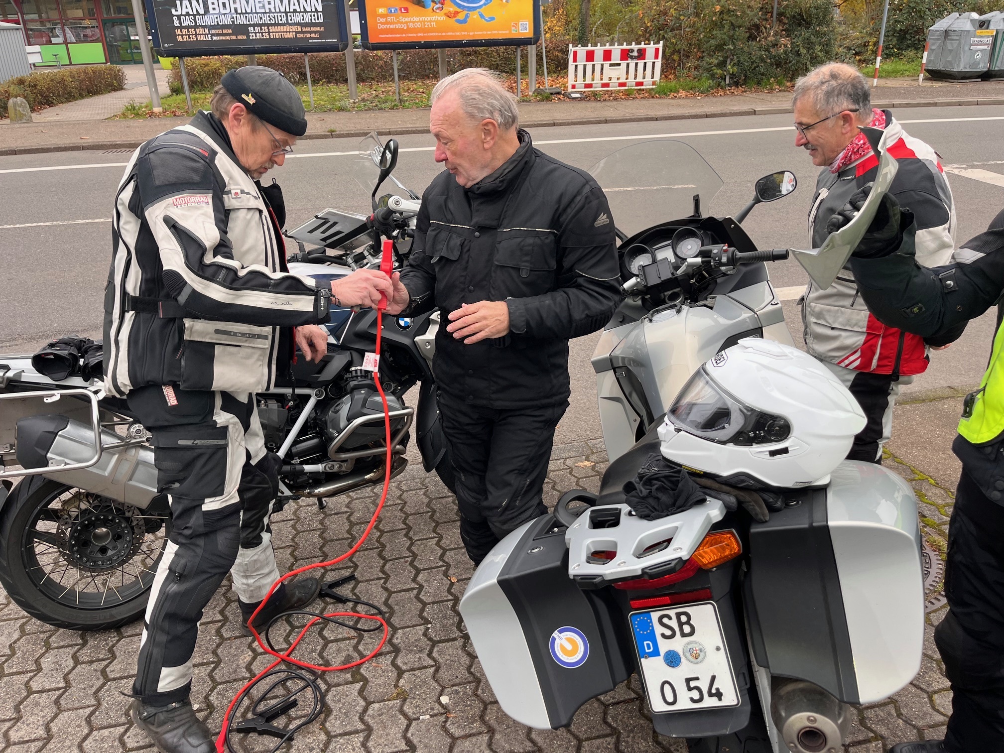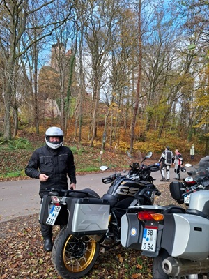 Gemessen am Wetterverlauf an den ersten Tagen der nachfolgenden Woche (Regen, Regen und Regen) war am Samstag, 16.November perfektes MotoTour-Wetter: Trockene Straßen und klares Wetter, jedoch mit gewöhnungsbedürftigen 4° beim Start in Saarbrücken. Der verzögerte sich leicht, denn Thomas wollte zwar, aber sein bestes Stück nicht! Nach dem Tanken gab das Moto beim Starten außer einem kurzen „Räuspern“ kein weiteres Lebenszeichen von sich. Wiederbelebung mittels Überbrückungskabel brachte Energie in die BMW zurück und uns in Bewegung: Michael als Guide, Anne, Jürgen B., Frank, Thomas und Dirk. Der Tag rüstete hoch auf konstante 6°, in günstigen Lagen sogar 8°. Wer freute sich da nicht auf die Kaffeepause mit Croissants fait en France – danke Michael! Motivation danach: Nur noch 60km bis zur Mittagspause. Und tatsächlich zeigte sich sogar die Sonne! Die Burgherren der „Burg Berwartstein“ im südlichen Pfälzerwald https://de.wikipedia.org/wiki/Burg_Berwartstein hatten wohl geahnt, dass sechs Biker aus dem Saarland zum Auftauen einkehren werden. Der Anbau der Gaststätte war durch einen Holzofen auf hochsommerliche Temperaturen geheizt. Und dazu ein Essen vom Feinsten: Holt euch Appetit beim Betrachten der Fotos! Die Mittagspause fuhr unsere Wärmespeicher hoch und auf der Rückfahrt über freigefegte Straßen mit entspannten Kurven kamen Gedanken an einstellige Temperatur überhaupt nicht mehr auf. Danke, Michael für die Tour – Première November.1 gelungen!