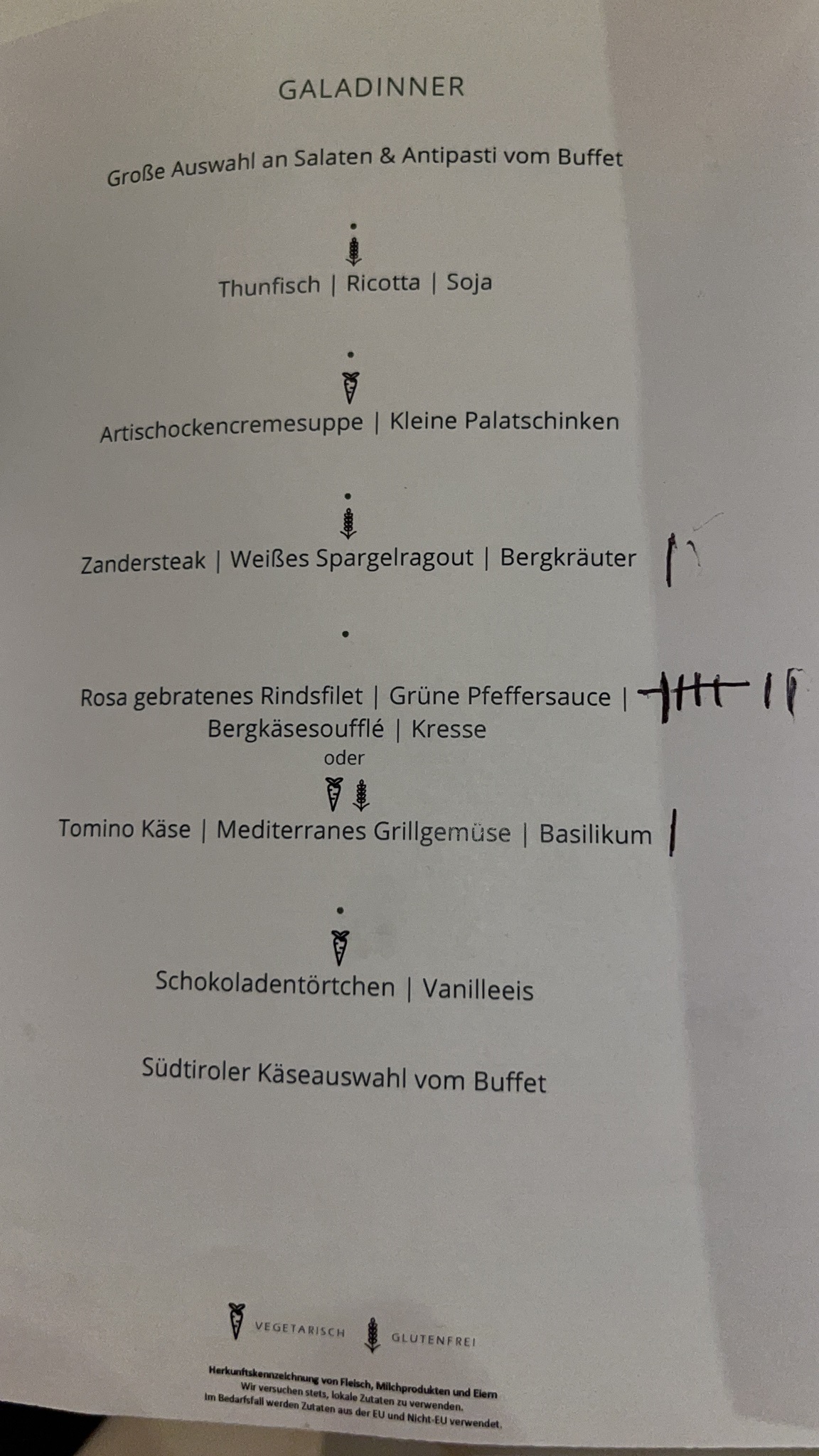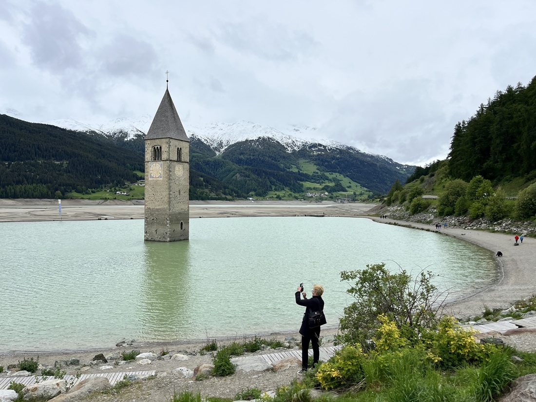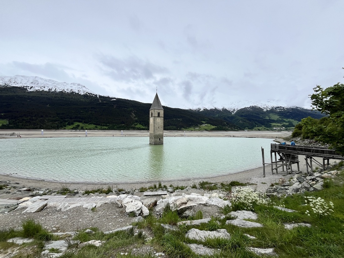 Start bei 7 Grad im Regen, 2 h Fahrt im Regen über Fernpass. Am Reschenpass ist es sehr kalt, der See hat wegen Bauarbeiten an der Straße kein Wasser. Dort zum Aufwärmen Pizza am Mittag. Weiter dann doch trocken in Halfling im Hirzer Hotel angekommen