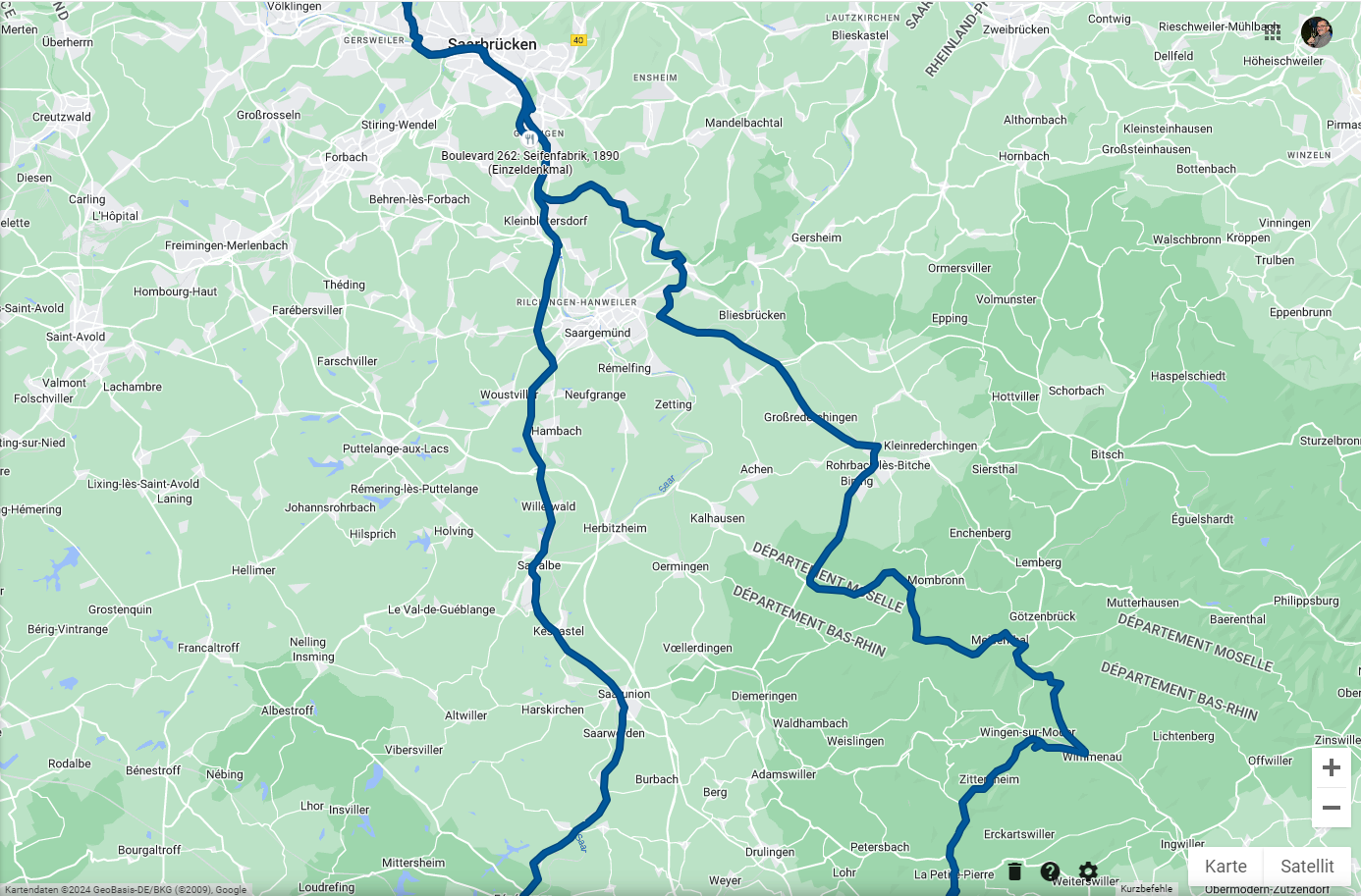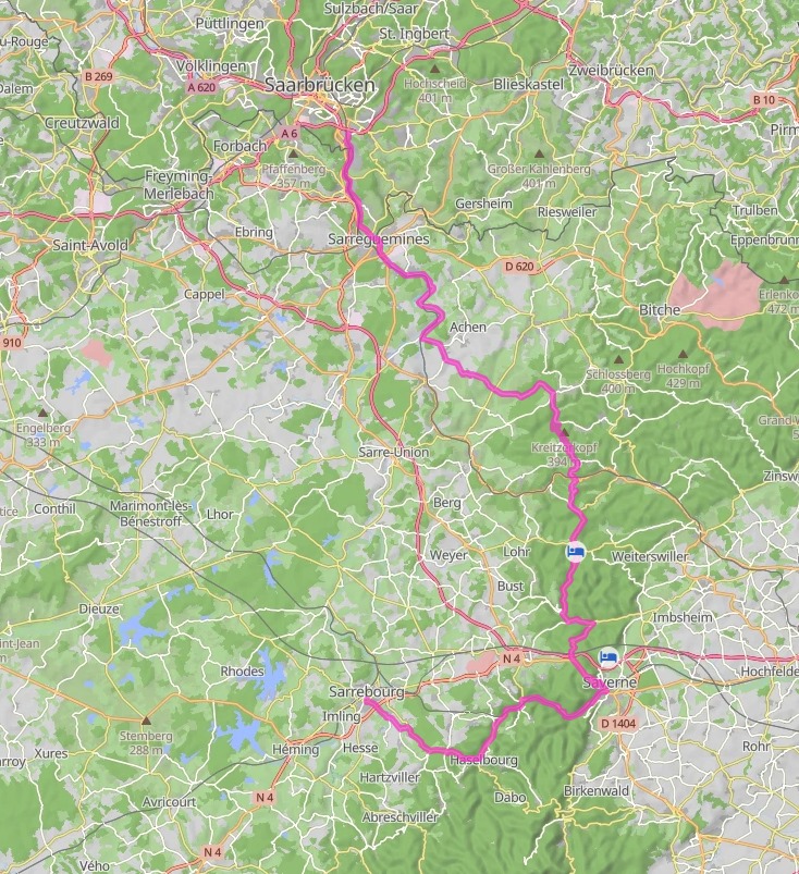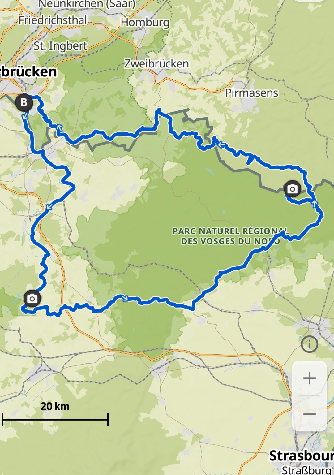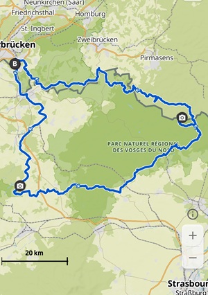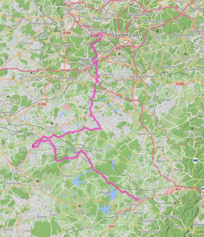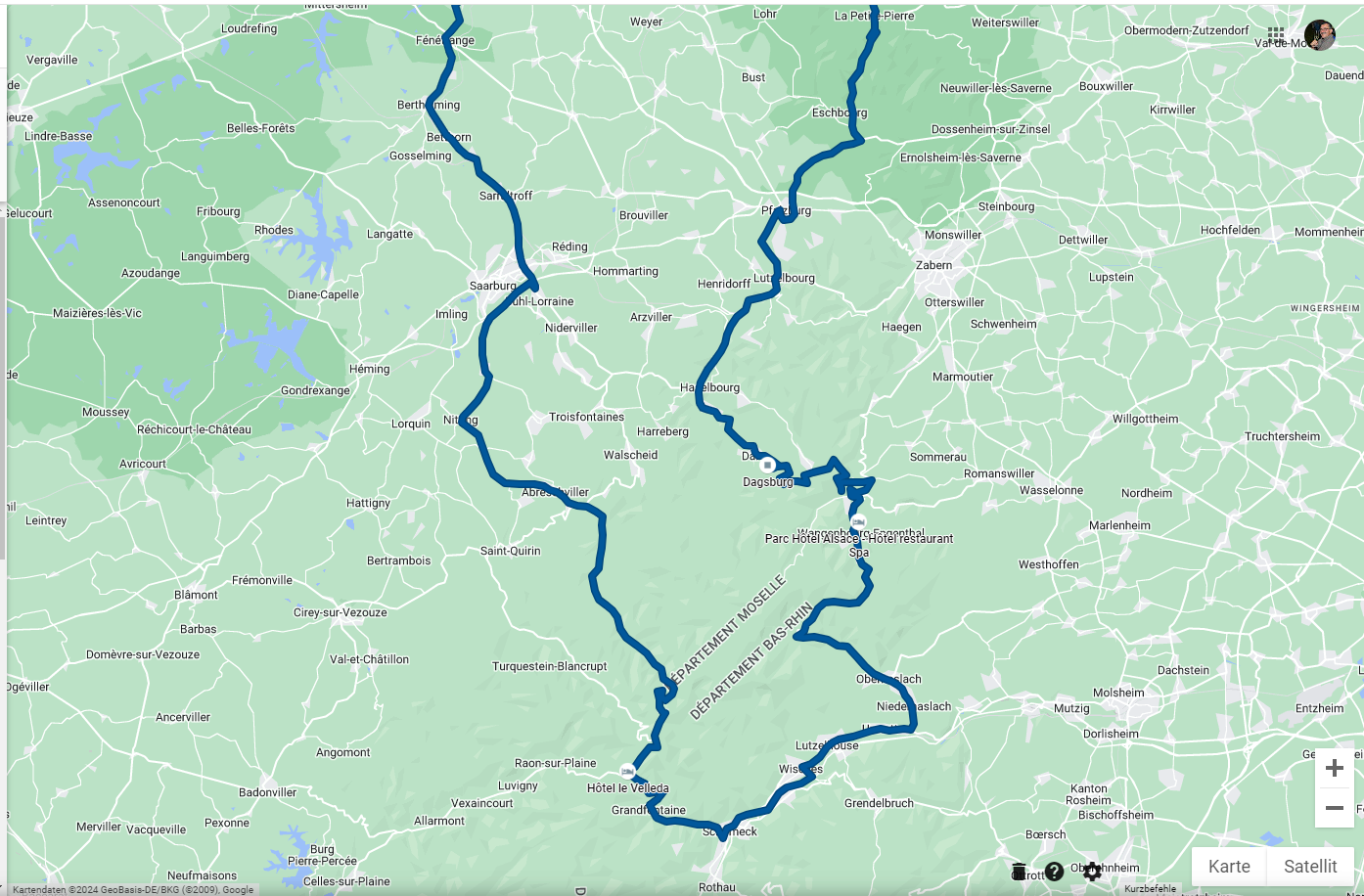 Daher kurz das Zitat von Claus über die Rückfahrt nach Saarbrücken: „Nach dem Essen lief Jürgen zur Höchstform auf. Über La Petite Pierre in Richtung Saargemünd fand er die schönsten Dörfer und kleinsten Straßen. Eine gelungene Ausfahrt!“