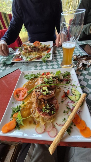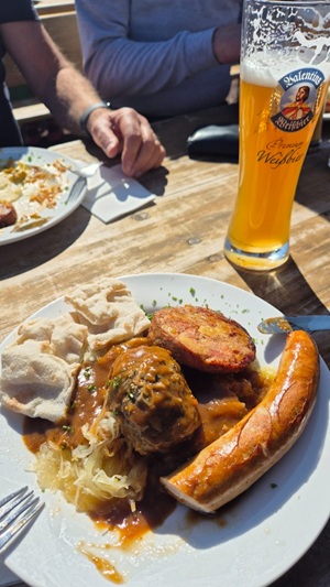 Freitag im Dauerregen: Ausflug mit dem öffentlichen Bus nach Pfronten ins Brauhaus Falkenstein. Beste bajuwarische Küche und tolles Bier.