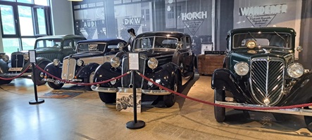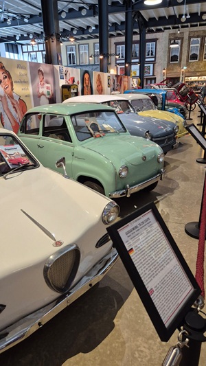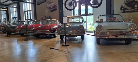 Aber nix mit Essen! Die Neugier auf das Museum ist größer als der Hunger und so tauchen wir ein in das Museum mit 90 Jahren Automobilgeschichte in Deutschland: Autos, Motorräder, Transporter - proudly „Made in Germany“! Horch, Borgward, BMW, Daimler-Benz, NSU, DKW, Kreidler, Zündapp, selbst Miele baute mal Mopeds! Mit Respekt bestaunst du die technische Entwicklung des Fahrzeugbaus, aber es meldet sich auch ein Gefühl von Beklommenheit bei der Realisierung, dass es viele der Entwickler und Hersteller gar nicht mehr gibt oder Rechte ins Ausland verkauft wurden…. Quo vadis „Made in Germany“? Mehr als 50% aller in Deutschland verbauten Autoteile kommen von außerhalb….