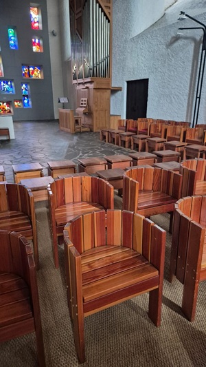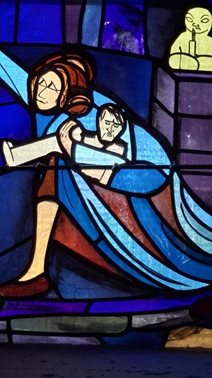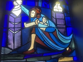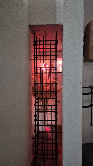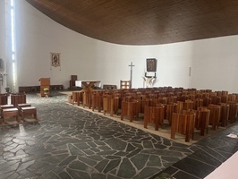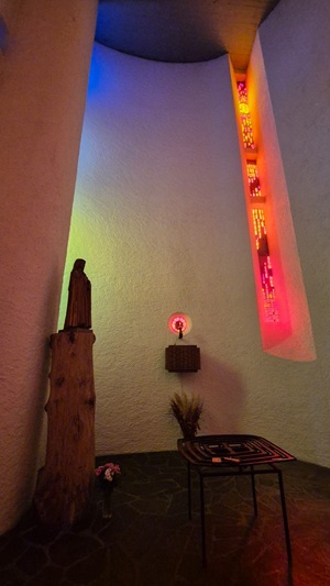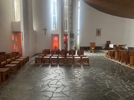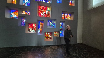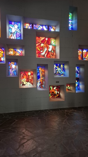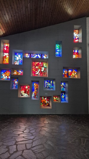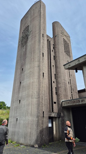 Diese Kirche konnte an diesem Samstag – wie von Dirk vorgesehen - besichtigt werden. Sie weist besonders ausgefallene Malereien aus, ein besonderes Ambiente innen und eine interessante Entstehungsgeschichte, die mit Eröffnung im Jahre 1968 endete. Ein wirklich bemerkenswertes Bauwerk, insbesondere auch vor dem Hintergrund, dass sich in der Fenstermalerei ein Fenster befindet, in welchem ein Engel den Kopf von Adolf Hitler auf dem Arm trägt. Motto: „Eine böse Versuchung“.