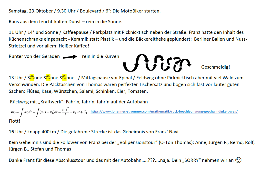 Ach ja: gelernt haben wir auch was: nämlich, dass ein Mopped im Leerlauf keinen Vortrieb hat. Gell, Jürgen ?