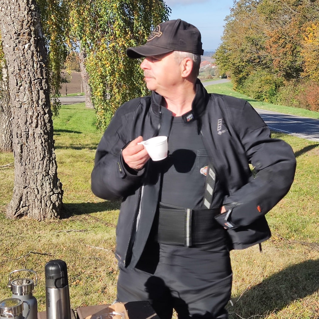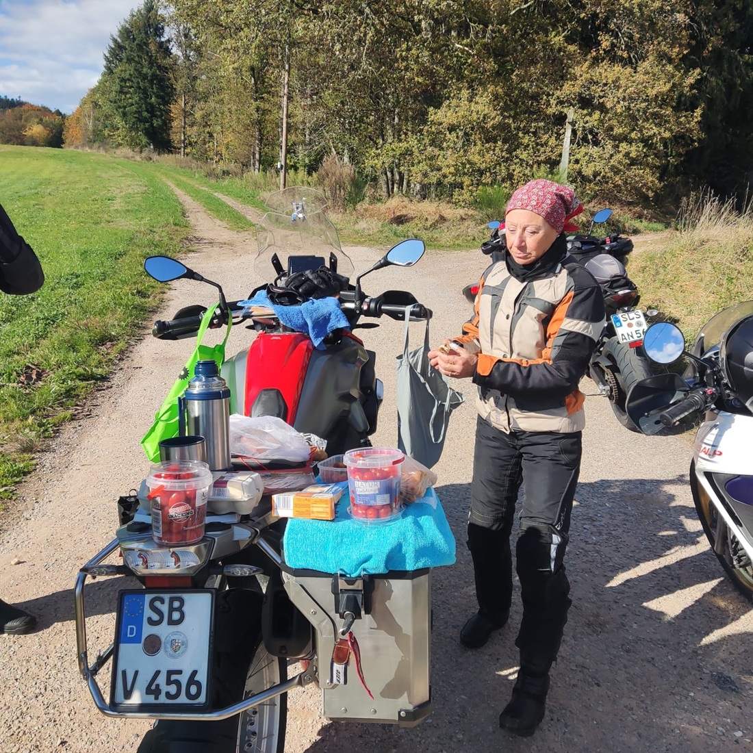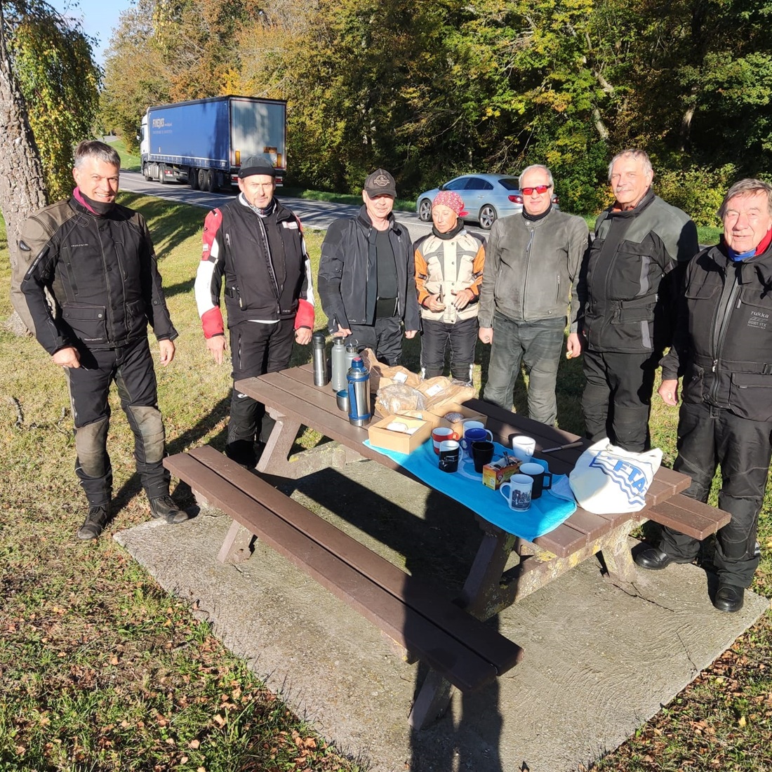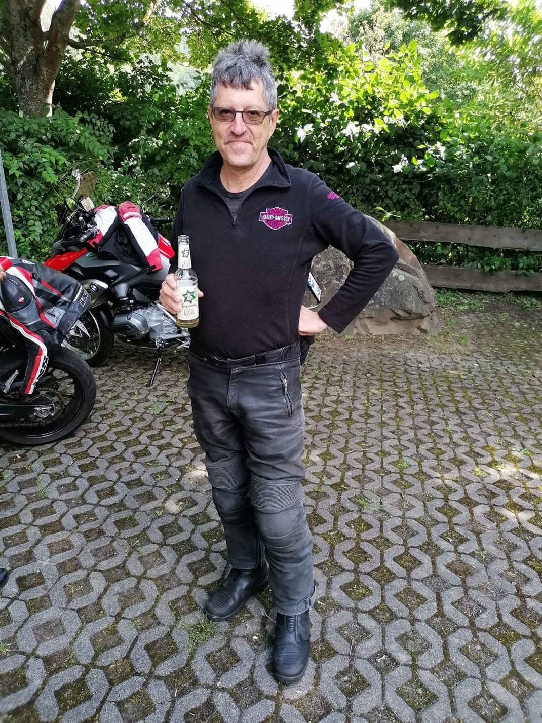 Wuselte hin und her und drumherum. Wollte er oder wollte er nicht? Der erste Versuch, konkret was zu bieten, schlug fehl. Zögerlich Gas geben – aber halt: Kaffee könnte jetzt guttun! Danach taten sich völlig neue Perspektiven auf und geschmeidig und gefühlvoll legte er sich in den Kurvenreichtum. Und dann – ja ja ja – oder vielleicht? Oder doch nicht? Kurz vor dem Ziel wurde er ausgebremst! Ließ sich ausbremsen! Tempo interruptus…. Also erst mal gudd gess. Zweiter Anlauf: Er zeigt, was in ihm und seiner Maschine steckt. Sicher! Gekonnt! Jürgen B. dreht auf!! Jürgen F. gab seiner Transalp so gut wie möglich die Sporen und Frank einen plus-Punkt.