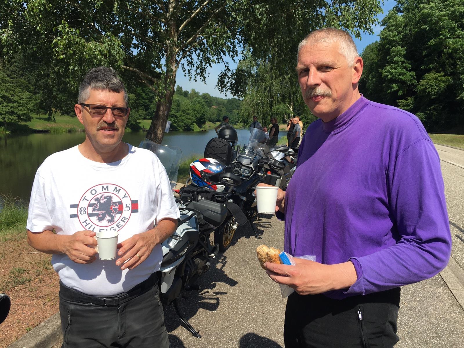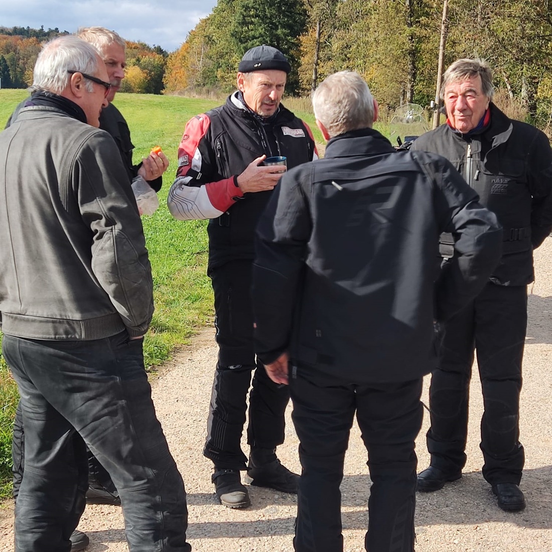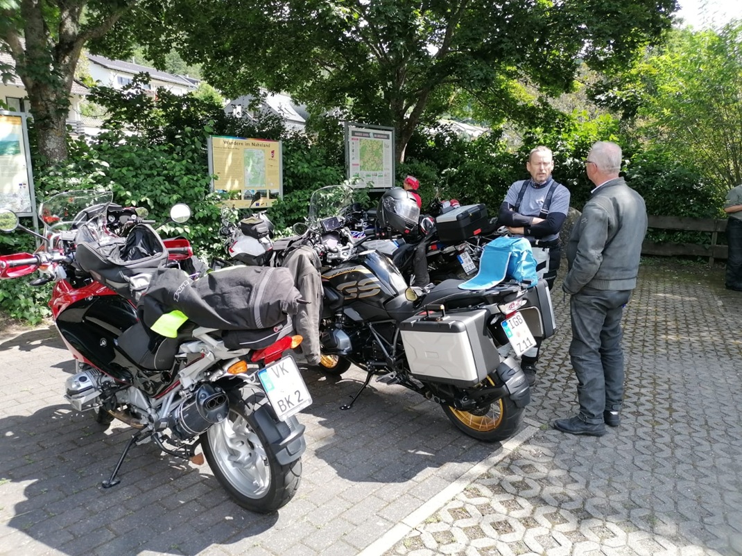 Wuselte hin und her und drumherum. Wollte er oder wollte er nicht? Der erste Versuch, konkret was zu bieten, schlug fehl. Zögerlich Gas geben – aber halt: Kaffee könnte jetzt guttun! Danach taten sich völlig neue Perspektiven auf und geschmeidig und gefühlvoll legte er sich in den Kurvenreichtum. Und dann – ja ja ja – oder vielleicht? Oder doch nicht? Kurz vor dem Ziel wurde er ausgebremst! Ließ sich ausbremsen! Tempo interruptus…. Also erst mal gudd gess. Zweiter Anlauf: Er zeigt, was in ihm und seiner Maschine steckt. Sicher! Gekonnt! Jürgen B. dreht auf!! Jürgen F. gab seiner Transalp so gut wie möglich die Sporen und Frank einen plus-Punkt.