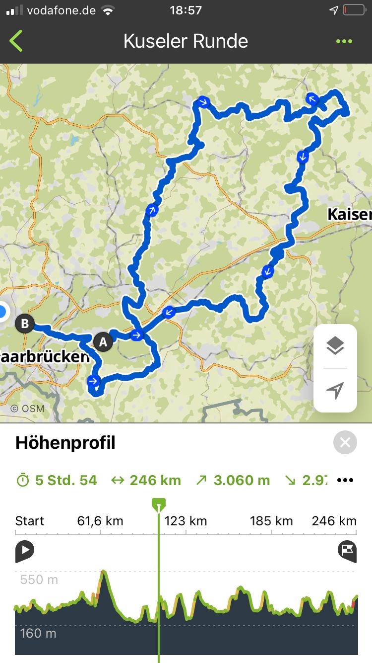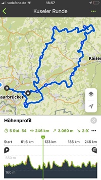 Die Kurven lagen auf ungefähr dieser Strecke: Saarbrücken, Altenkessel, Altenkessel, Altenkessel, Dirmingen, Tholey (Die Fenster in der Abtei schauen wir ein anderes Mal an), Bostalsee (Kaffee), Hermeskeil, Zerf, Mannebach (Gudd gess!), via Luxemburg, Remich rüber, Orscholz, Bethingen, Waldwisse, Flastroff und weiter über die Dörfer nach Saarbrücken.