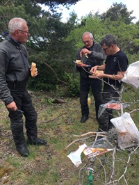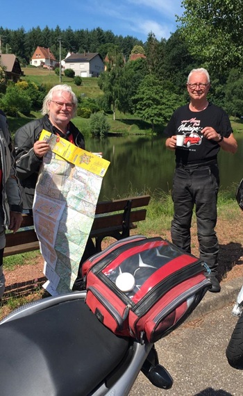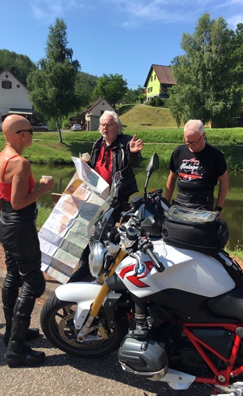 Weiterfahrt mit der Erfahrung: Auch in Luxemburg gibt es „Barricaden“, aber auch schattige Plätze neben der Straße zu Rast und Picknick. Marwin am Fon mit Jürgen B. versucht Wegbeschreibung. Thomas aus dem Off: „Paris – Bagdad – Müllerthal!“ Rolf ergänzend : „Aber nicht über Bierberg!“