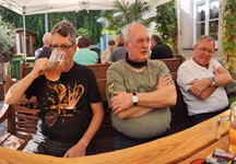 Beginn 18 Uhr laut Annes Ankündigung und der Info auf der HP, die Michael dort eingestellt hat. Sind auch fast alle da: Stefan, Rolf, Anne, Torsten, Feuerhake, Thomas, Anne – nebst den „besseren Hälften“. Michael? Fast 18.30 Uhr – wo bleibt er? Helmut?